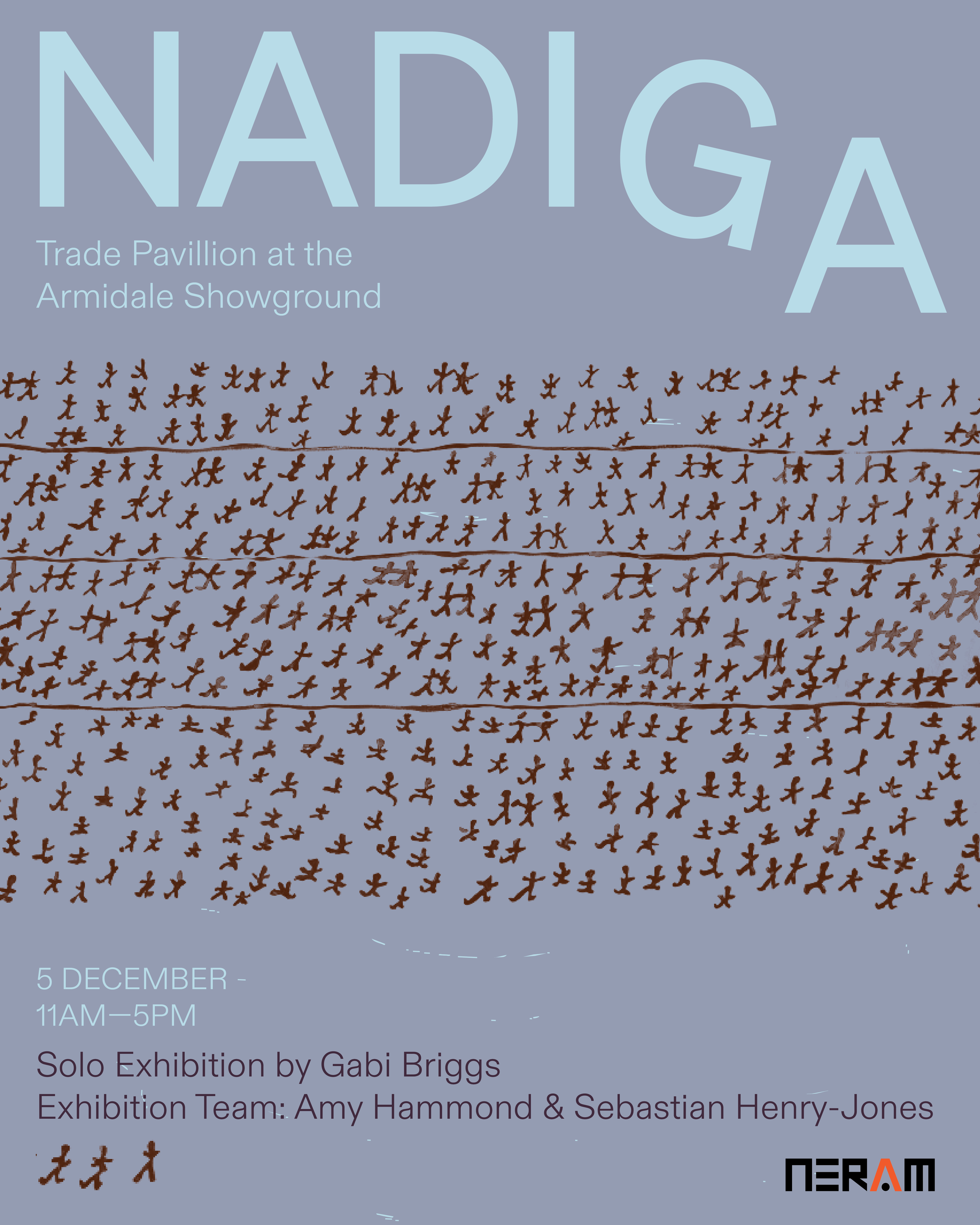 NADIGA means walk in Anaiwan. It is also the title of a day-long exhibition by Anaiwan artist Gabi Briggs at the Armidale Showground. The notion that walking Country is a form of knowledge-regeneration underpins three works: GEDYURA, TENYA, and ARKAN & IRBELA. These have only ever been shown in Melbourne on Wurundjeri Country and as such, their journey to Armidale can be understood as a return home. This exhibition forms a key component of her PhD research.