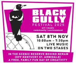 Find out more »The always highly-anticipated Black Gully Festival is set to kick off on Saturday, November 8th, 2025, in the scenic Black Gully Reserve (behind NERAM on the south side of the creek).